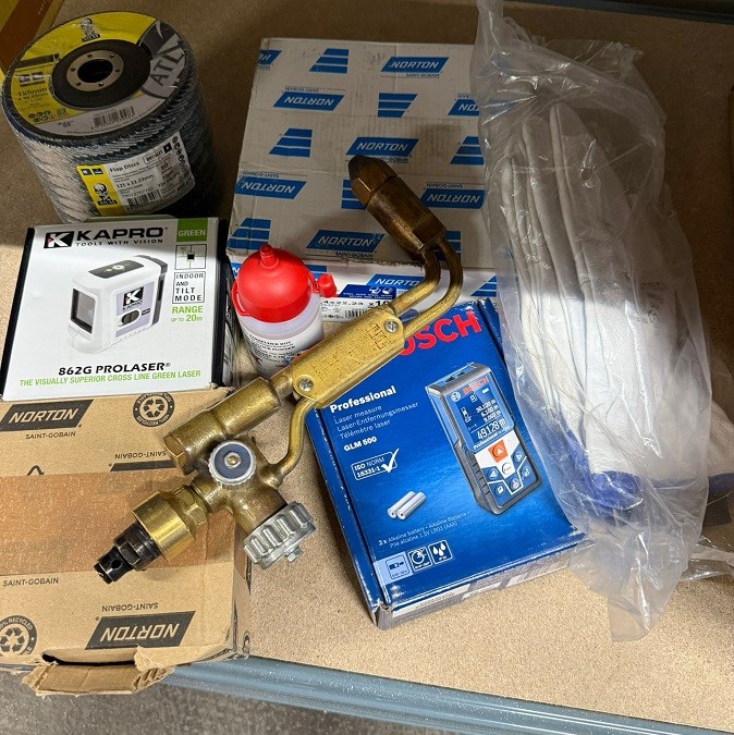 - laser 1 kom, metar laserski 1 kom, komplet gedora 1 kom, svrdlo 1 kom, maska za zavarivanje 1 kom, elektrode 3 kom, čelična četka za čišćenje 1 kom, plinski rezač 1 kom, rukavice 6 kom, kutnik 4 kom, sprej cinkolit 6 kom, pasta za rukavice 1 kom, sredstvo za obilježavanje 1 kom, rezna ploče 125x6,4 145 kom, brusne ploče 180x6,4 10 kom, brusne ploče 230x1,9 10 kom