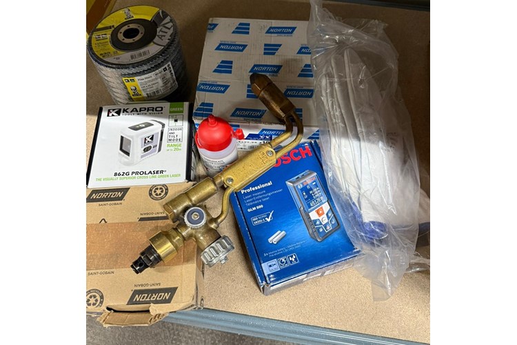 - laser 1 kom, metar laserski 1 kom, komplet gedora 1 kom, svrdlo 1 kom, maska za zavarivanje 1 kom, elektrode 3 kom, čelična četka za čišćenje 1 kom, plinski rezač 1 kom, rukavice 6 kom, kutnik 4 kom, sprej cinkolit 6 kom, pasta za rukavice 1 kom, sredstvo za obilježavanje 1 kom, rezna ploče 125x6,4 145 kom, brusne ploče 180x6,4 10 kom, brusne ploče 230x1,9 10 kom